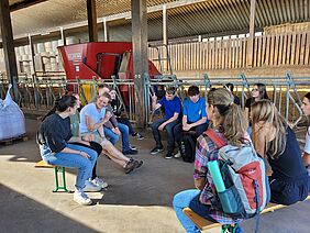 Bildunterschrift: Schülerinnen und Schüler der 11. Jahrgangsstufe des Martin-Pollich-Gymnasiums, Mellrichstadt diskutieren mit Bio-Erlebnisbäuerin Claudia Hartmann über Biodiversität in der Landwirtschaft.