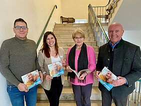 Bildunterschrift: Sie halten schon den neuen Seniorenratgeber des Landkreises in den Händen. (Von links) Thomas Bruckmüller (Behindertenbeauftragter des Landkreises Rhön-Grabfeld), Selina Pfülb (Fachstelle für Senioren und Menschen mit Behinderung), Gabi Gröschel (Seniorenbeauftragte des Landkreises Rhön-Grabfeld) und Landrat Thomas Habermann.