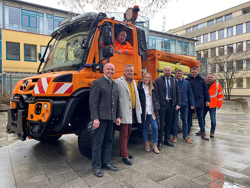 Bildunterschrift: Haben gemeinsam den Weg frei gemacht für das Projekt „SmarteWinterdienst“ (v.l. n. r.): Landrat Thomas Habermann, Ulrich Dolze (Leiter Tiefbau), Isabel Dörr und Frank Reichert (Stabsstelle Kreisentwicklung), Stephen Johannes (Geschäftsführer Interkomm-IT), Dr. Jörg Geier (Stabsstellenleiter Kreisentwicklung) und Karsten Schilling (Leiter Kreisbauhof). Am Steuer: Marco Jokiel (Kreisbauhof) (Foto: Melanie Hofmann/Landkreis Rhön-Grabfeld).