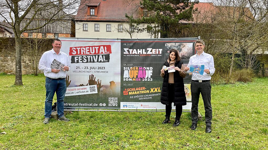 Foto: v.l.r. Bernd Roßmanith (2. Bgm Mellrichstadt Organisator Festival), Linda Denner (Landkreis Rhön-Grabfeld), Michael Kraus (1. Bgm. Mellrichstadt) Foto: Luisa Denner