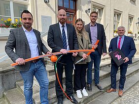 Auf dem Bild von links: Michael Werner (1. Bürgermeister der Stadt Bad Neustadt a. d. Saale), Frank Reichert (Landkreis Rhön-Grabfeld - Stabsstelle Kreisentwicklung), Louisa Rosin (Landkreis Rhön-Grabfeld - Stabsstelle Kreisentwicklung), Maximilian Pfister (Geschäftsleiter der Stadt Bad Neustadt a. d. Saale) und Thomas Weigand (Kommunalberater Glasfaser - Deutsche Telekom Technik GmbH).