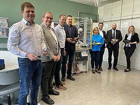 Bildunterschrift: IT für die Schülerinne und Schüler greifbar machen und gleichzeitig die digitale Infrastruktur regional bündeln. Der Landkreis arbeitet mit seinen engagierten Partnern und den neu zugeteilten Fördermitteln in Höhe von rund 860.000 Euro weiter intensiv daran den Fortschritt in die Schullandschaft Rhön-Grabfelds zu bringen. Auf dem Bild von links nach rechts: Stephen Johannes und Ansgar Zimmer (beide Geschäftsführer Interkomm-IT Rhön-Grabfeld GmbH), StD Christan Stöhr (stellv. Schulleiter) und OStR Florian Heigl (beide Jakob-Preh-Schule), weitere stellv. Landrätin Eva Böhm, Bürgermeister Michael Kraus (Kreisvorsitzender Bayerischer Gemeindetag), Frank Reichert (Stabsstelle Kreisentwicklung) und Bildungskoordinatorin Jurgita Groß (beide Landkreis Rhön-Grabfeld).