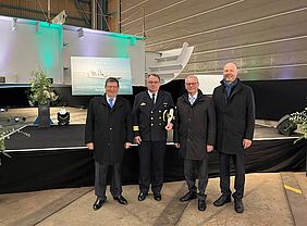 Bildunterschrift: Bei der Kiellegung der „Rhön“ in Rostock waren stellvertretender Landrat Josef Demar (Landkreis Rhön-Grabfeld), Kommandeur Troßgeschwader Thorsten Geldmacher, stellvertretender Landrat Gotthard Schlereth (Landkreis Bad Kissingen) und Klaus Spitzl Naturpark Rhön Geschäftsführer mit dabei. (Foto: NVL)