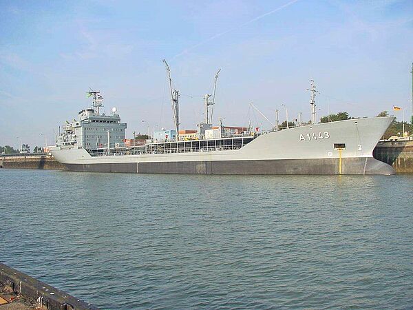 Bildunterschrift: Mit 130 Meter Länge, 19,30 Meter Breite und einer Verdrängung von 14169 Tonnen gehört die „Rhön“ zu den größten Schiffen der Marine. Beladen ist sie mit über 10 Millionen Liter Dieselkraftstoff und 800 Tausend Liter Flugkraftstoff zur Abgabe an die Kampfschiffe in See. (Foto: Hanns Friedrich)