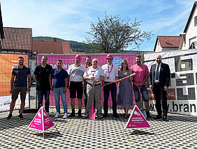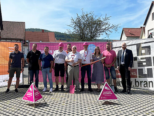 Bildunterschrift: Über den Beginn der Ausbauarbeiten in der Gemeinde Sandberg freuen sich (von links): Dennis Kirchner | Fachreferent - Deutsche Telekom Technik GmbH, Markus Ledermann | Projektleiter Tiefbau FttH - CIRCET Kabel Service GmbH, Fabian Wirthwein | Technischer Leiter - CIRCET Kabel Service GmbH, Ralf Müller | Baubegleiter - Deutsche Telekom Technik GmbH, Erwin Voll | Mitglied des Gemeinderates der Gemeinde Sandberg, Siegfried Söder | 2. Bürgermeister der Gemeinde Sandberg, Thomas Andreas Hofmann | Kommunalberater Glasfaser - Deutsche Telekom Technik GmbH, Louisa Rosin | Landkreis Rhön Grabfeld, Christian Weiss | Bauleiter - Brandl-Bau GmbH & Co. KG, Frank Reichert | Landkreis Rhön-Grabfeld.