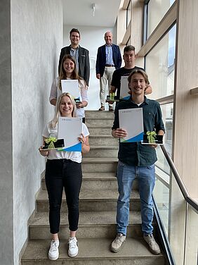 Bild: Landrat Thomas Habermann (oben rechts) gratulierte gemeinsam mit dem Leiter der Personalstelle, Andreas Neumann-Lischke (oben links) Ann-Kathrin Suckfüll, Tom Baumgart (Mitte) sowie Julia Eyring und Johannes Sturm (unten) zur erfolgreich absolvierten Ausbildung (Foto: Melanie Hofmann/Landkreis Rhön-Grabfeld).