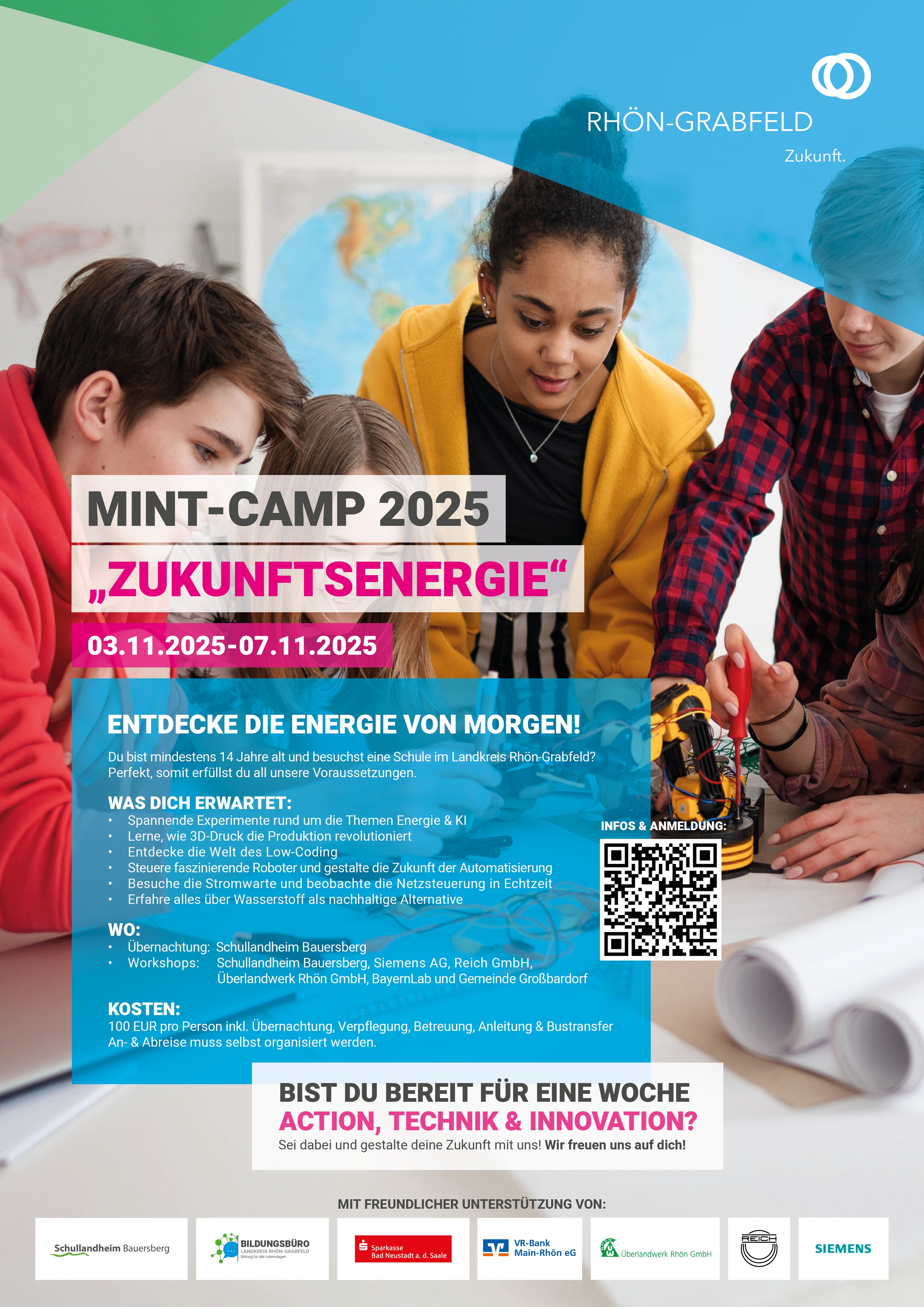 Vom 3. bis 7. November 2025 verwandelt sich das Schullandheim Bauersberg in ein Zentrum für junge Zukunftsgestalterinnen und -gestalter. Unter dem Motto „Zukunftsenergie – Entdecke die Energie von morgen“ lädt das erste MINT-Camp des Landkreises Rhön-Grabfeld Schülerinnen und Schüler ab 14 Jahren zu einer spannenden Entdeckungsreise in die Welt von Energie und Künstlicher Intelligenz ein.
