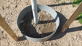 Praktisch sind sogenannte Gießränder (siehe Foto) – kleine Wälle um den Stamm –, die das Wasser am Stamm halten und ein langsames Versickern ermöglichen.