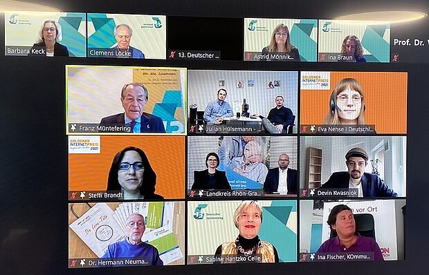 Auf dem Bild zu sehen: Franz Müntefering (links oben, gelb umrahmt) gratulierte auch dem Landkreis Rhön-Grabfeld (mitte) zum Goldenen Internetpreis 2021.