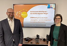 Bild: Projektleiterin Veronika Enders von der Fachstelle für Senioren und Menschen mit Behinderung im Landratsamt Rhön-Grabfeld freut sich mit Roland Mai, dem Leiter des BayernLab Bad Neustadt, über die Auszeichnung Goldener Internetpreis 2021.