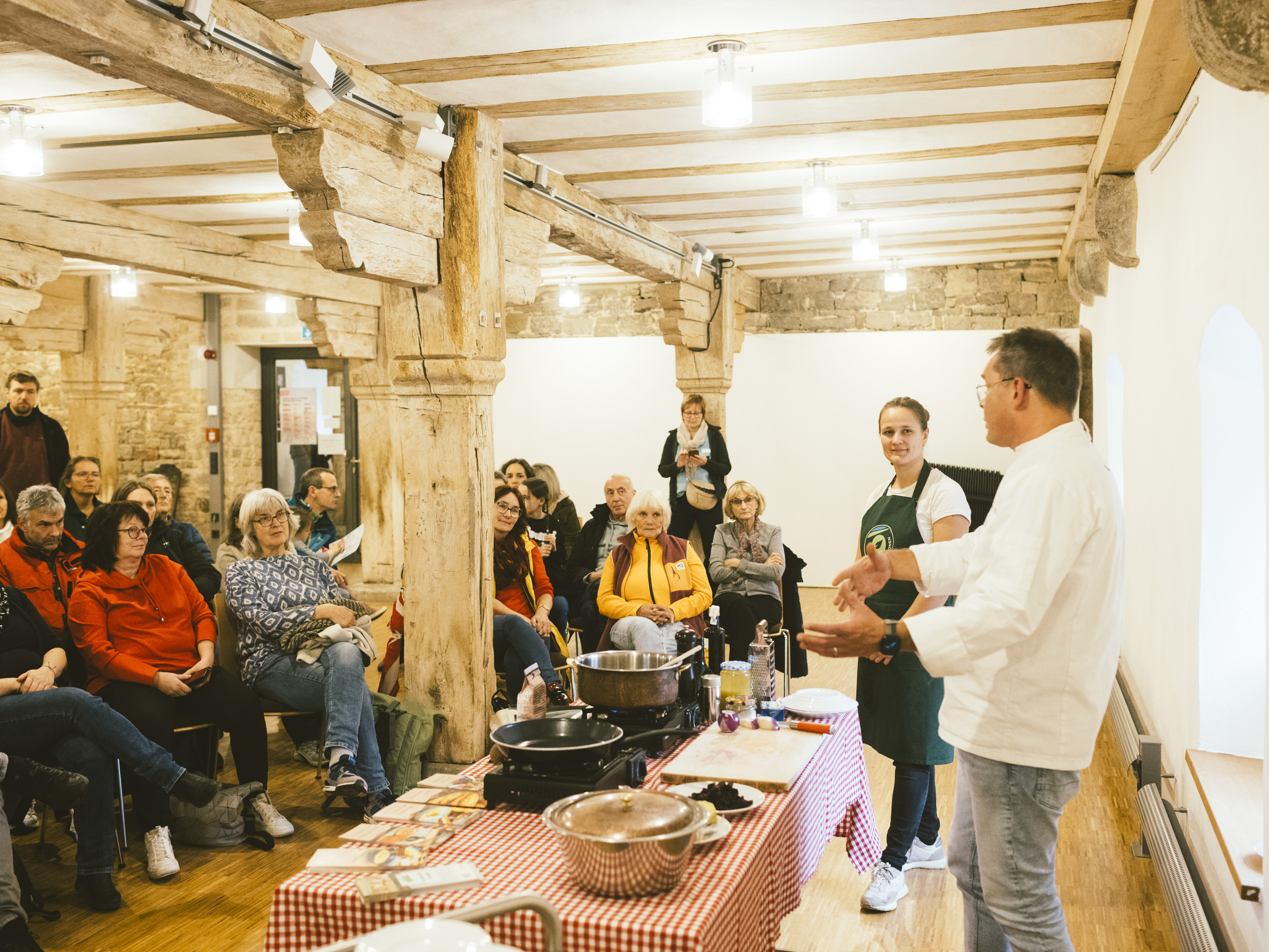 Dass dieses auch lecker zubereitet werden kann, das führte Thomas König (Rhön GmbH und Mitglied der Slowfood Chef Alliance) bei einer Bio-Kochshow vor. Aus bio-regionalen Zutaten bereitete er ein leckeres Dinkelrisotto mit roter Bete zu. Die Zuschauerinnen und Zuschauer waren geschmacklich überzeugt und wer wollte, konnte die benötigten Zutaten direkt bei den Bio-Erzeugern vor Ort einkaufen.