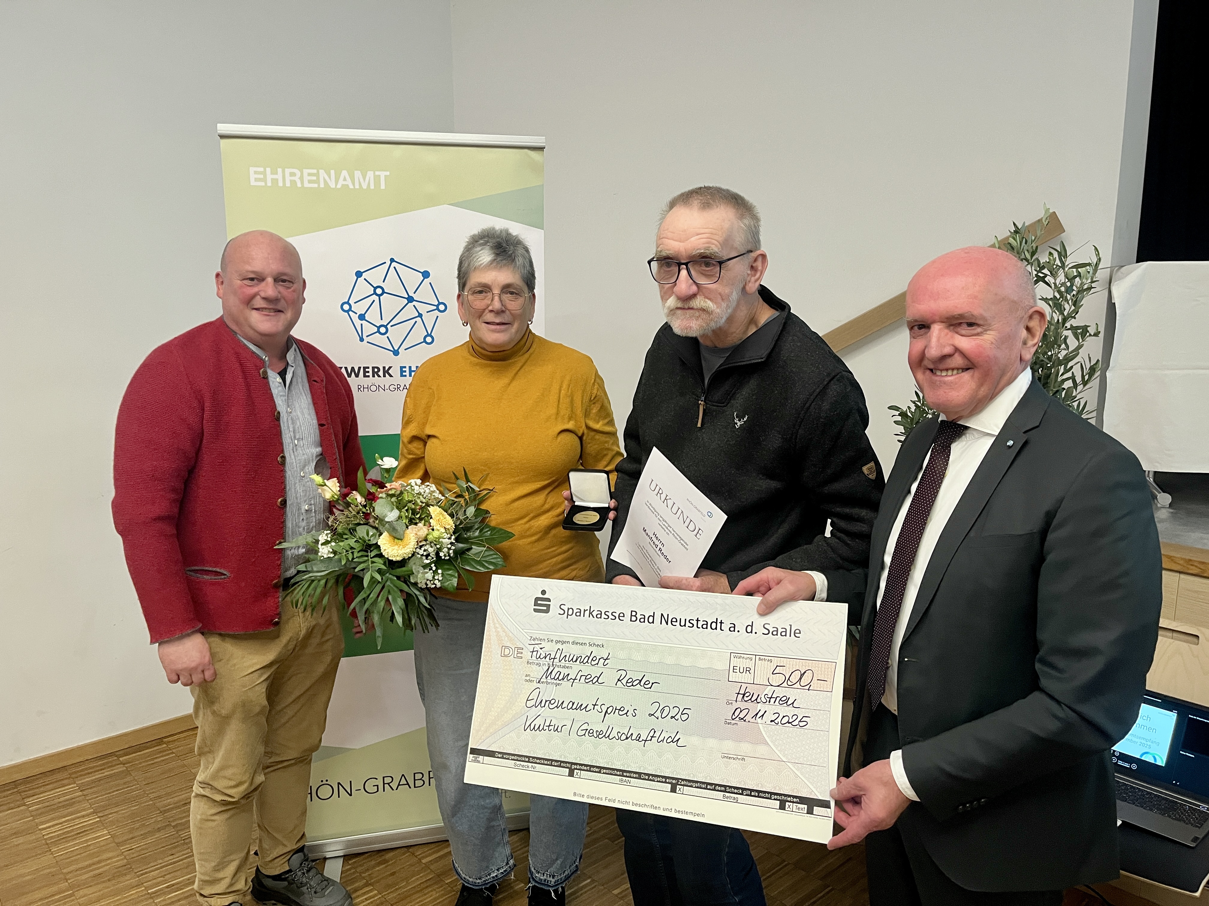 Bildunterschrift: Manfred Reder aus Bischofsheim i. d. Rhön (Dritter von links) gewann den Ehrenamtspreis in der Kategorie “Kultur/Gesellschaftlich”.