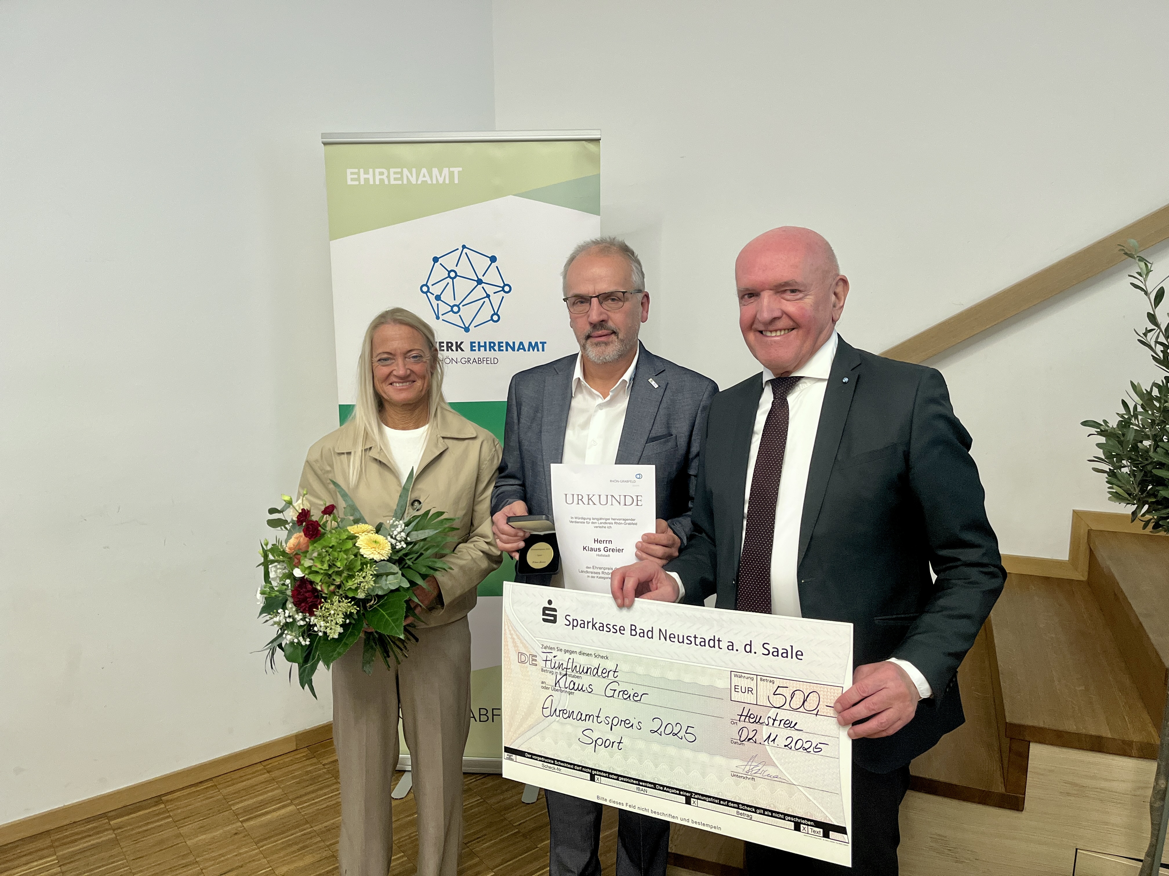 Bildunterschrift: Klaus Greier aus Hollstadt (Mitte) gewann den Ehrenamtspreis in der Kategorie “Sport".