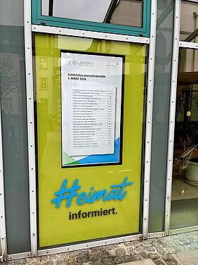 Seit kurzem gibt es eine weitere Informationsquelle im Landratsamt Rhön-Grabfeld. Links neben der Eingangstüre im Fenster - zu erkennen an der auffälligen Beklebung - findet sich ein weiterer Informationsbildschirm. Dort gibt es jederzeit die aktuellsten Informationen aus dem Landkreis - Nachrichten, Bekanntmachungen, Veranstaltungen und alles Wissenswerte aus Rhön und Grabfeld. Momentan sind hier auch alle Informationen rund um die Kommunalwahl 2026 zu finden.