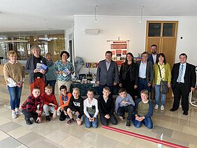 Projektmanagerin Manuela Michel und der stellvertretene Landrat Josef Demar begrüßten alle Anwesenden herzlich zur Eröffnung der Fairtrade-Ausstellung. Die Unterschiede hinsichtlich der Lebenserwartung, die es auf der Welt gibt, hatten die Viertklässler der Grundschule Burglauer auf ganz besondere Weise sichtbar gemacht und präsentierten diese jetzt bei der Eröffnung. Stühle, die in den Landesflaggen-Farben der entsprechenden Länder bemalt waren, haben ganz unterschiedlich hohe Stuhlbeine, die um einen reich gedeckten Tisch jetzt stehen. Die Botschaft dahinter: theoretisch gibt es genug Ressourcen – aber nicht alle haben die gleichen Chancen diese zu erreichen. Darauf ging auch Norbert Dietz vom Eine-Welt-Laden Bad Neustadt, der gleichzeitig Mitglied der Steuerungsgruppe Fairtrade-Landkreis ist, näher ein. Er erinnerte daran, dass Deutschland Berechnungen zufolge in diesem Jahr bereits am 4. Mai seine ökologischen Ressourcen für das gesamte Jahr 2022 aufgebraucht hat.