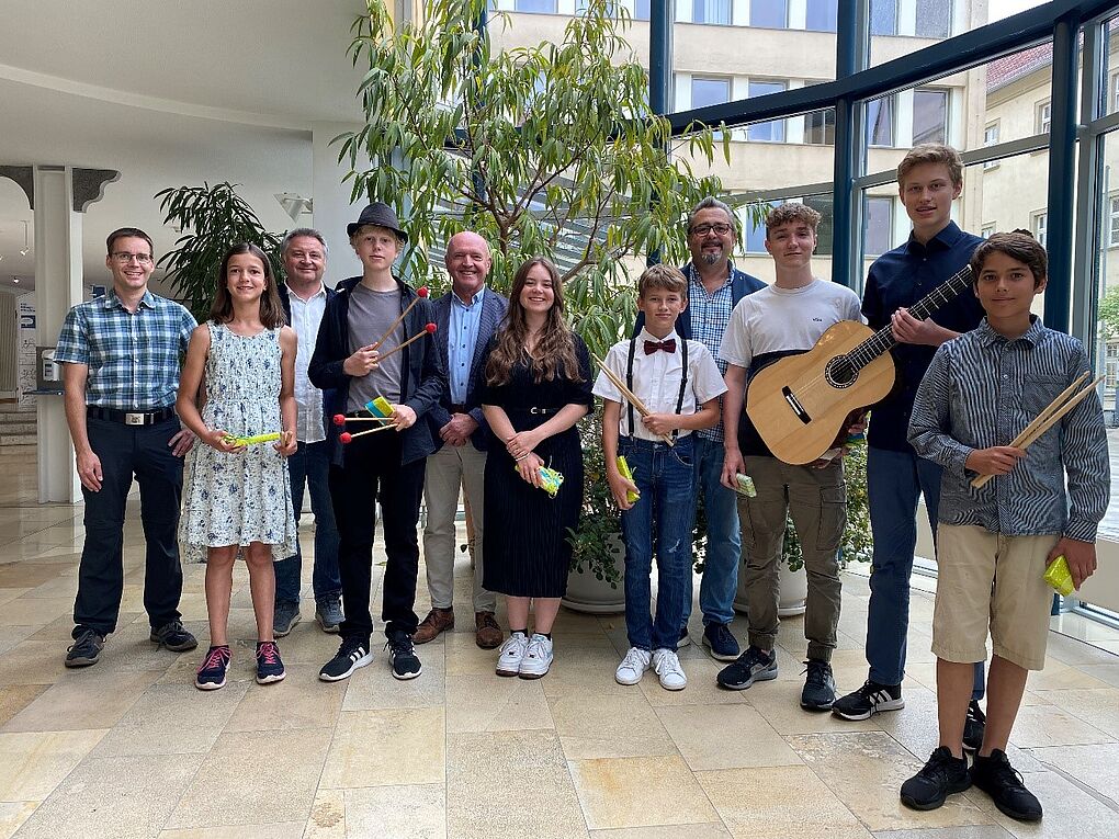 Haben bei „Jugend musiziert“ 2022 erfolgreich teilgenommen: v. L. n. R.: Sophie Lemmerich, Julius Dehnel, Cilli Schwen, Max Seifert, Paul Manger, Maximilian Kreuzer und Luca Büttner. Mit auf dem Bild die Lehrkräfte Adrian Blümm, Jaroslaw Kantorski, sowie Landrat Thomas Habermann und Schulleiter Frank Stäblein. (Foto: Melanie Hofmann/Landkreis Rhön-Grabfeld