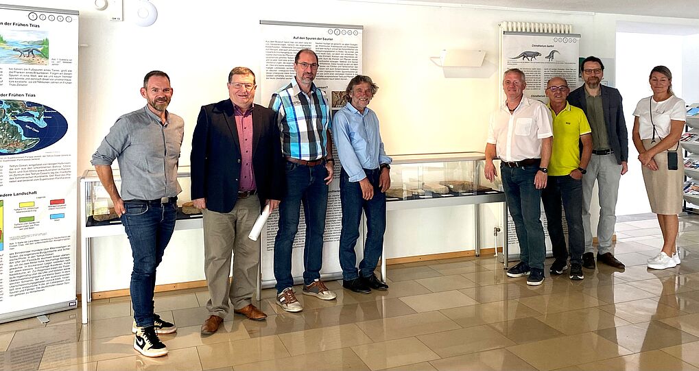 In einem Gemeinschaftsprojekt der NES-Allianz wurde deshalb mit Mitteln des Regionalbudgets eine Wanderausstellung konzipiert, die regelmäßig in Kindergärten, Schulen und Rathäusern in den NES-Allianz-Kommunen präsentiert wird. Hans Volkmuth ist Hobby-Paläntologe und wesentlicher „Macher“ des Projekts und der Ausstellung. Auch Dr. Nicolas Zenzen, Kulturmanager und Leiter des Henneberg-Museums der Stadt Münnerstadt, unterstützte die „Saurierprojekte“ in der NES-Allianz.