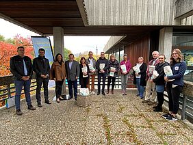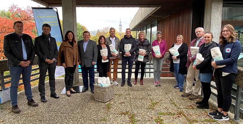 Bildunterschrift: Gemeinsam freuen sie sich, dass die Schwimmförderungen des Landkreises und des Freistaates so gut angenommen werden (v.l.n.r.): Kreisentwicklungs-Stabsstellenleiter Dr. Jörg Geier, Mellrichstadts Bürgermeister Michael Kraus, Annette Müller-Mann (Stabsstelle Kreisentwicklung), stellv. Landrat Josef Demar, Andrea und Kurt Kregler, Volker Schmitt (Ostheim), Kerstin Cabut (Wasserwacht MET), Susanne Hölderle (Triamare Bad Neustadt), Stephanie Denner (Vfl NES), Gert Müller (Vfl Sportfreunde Bad Neustadt) , Ramona Weidinger und Clara Jäger (Wasserwacht KÖN) (Foto: Simone Stock).