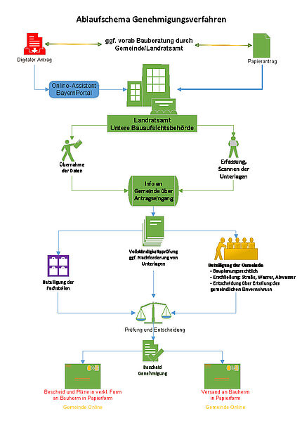 Es besteht auch weiterhin die Möglichkeit, beim Landratsamt Rhön-Grabfeld Anträge in Papierform einzureichen. Da wir die Unterlagen digitalisieren, ist nur noch ein vollständiger Plansatz erforderlich. Anträge auf Genehmigungsfreistellung in Papierform müssen allerdings wie bisher bei den Gemeinden vorgelegt werden, weil die Gemeinde entscheidet, ob am Landratsamt ein Baugenehmigungsverfahren durchgeführt werden soll.